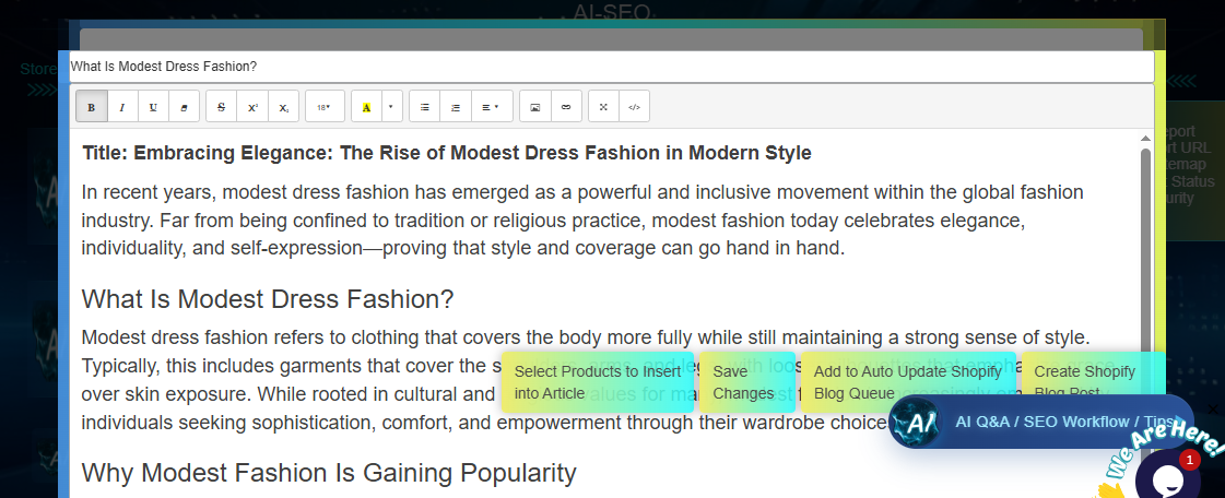 2.Use the extracted keywords to generate articles with AI.After generation, review the content to ensure it's complete and remove any AI-explanatory text. Then, click to insert your relevant product. (Purpose: When users search for the keyword and land on your article, they’ll see your product—clicking it redirects them to your Shopify store, increasing conversion rates.) Once the article is saved and verified, click "Sync & Create" to publish it as a blog post on your Shopify store.